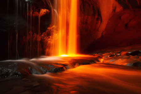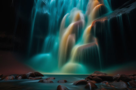 This breathtaking image captures the beauty of a waterfall at night, illuminated by a soft, ethereal glow. The cascading water shimmers and sparkles in the darkness, creating a sense of wonder and magic. This image is sure to inspire and uplift anyone who views it.