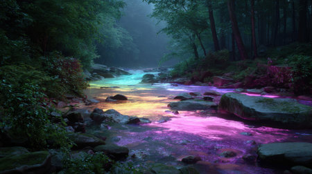 A beautiful forest stream flows gently through a tranquil landscape, reflecting vibrant colors in the water as dusk settles in.