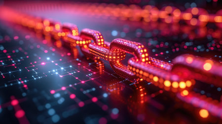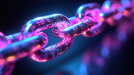 A luminous, high-tech chain link radiates neon light, representing robust digital connections and cutting-edge cybersecurity within an interconnected network.