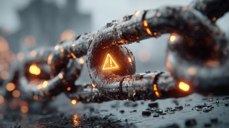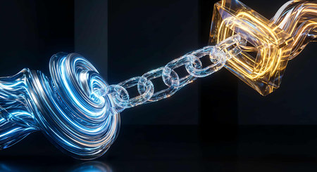 A sleek, high-tech chain with luminous orange accents representing resilience and unity against a vibrant digital backdrop of interconnected circuits and glowing dat