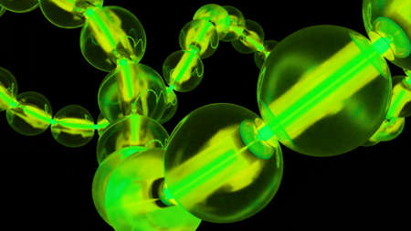 3D necklace of beads. Design. Bright beads move in line on black background. Curved line of moving bright beads. Chain of large bright balls for jewelry