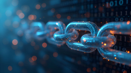 Intricate futuristic digital chain symbolizing blockchain technology with binary code details