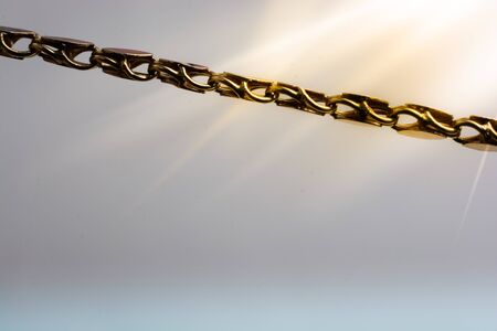A detailed shot of a luminous gold chain link illuminated against a soft, shimmering bokeh backdrop, evoking elegance and luxury.