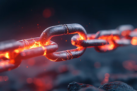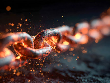 A weathered chain illuminated by fiery sparks and scorching heat, set against a shadowy backdrop, embodying unwavering endurance and strength amidst adversity.