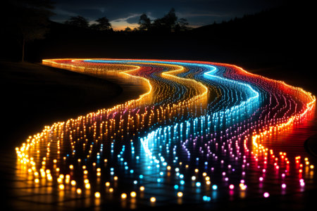 This image captures a captivating scene of multicolored lights forming a radiant tunnel, reflecting vividly on a surface, creating an immersive and enchanting visual experience that evokes wonder and excitement, AI generated image