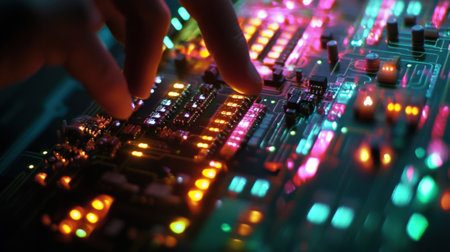 A close-up shot showcasing vibrant colorful lighting effects on electronic components. The image features an abstract play of light and color, ideal for technology themes.
