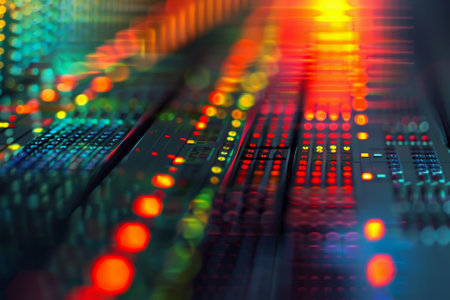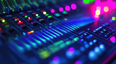 Close-up view of an audio mixing console featuring vibrant LED lights and colorful buttons, showcasing the intricate design of sound engineering and music production equipment.