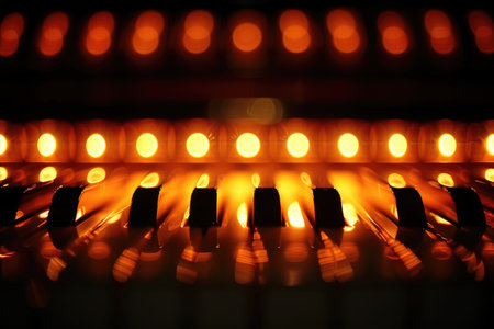 Close view of a DMX lighting controller showing glowing buttons and sliders in a dark setting designed for tech activities.