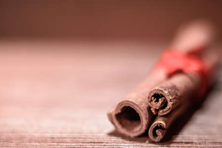 Horizontal shot of cinnamon sticks tied with red ribbon closeup on wooden background blur. Copy space.