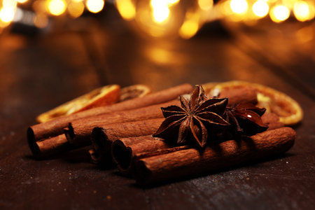 Cinnamon sticks and star anise on a wooden table with bokeh background