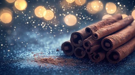 Cinnamon sticks. Selective focus, bokeh lights.