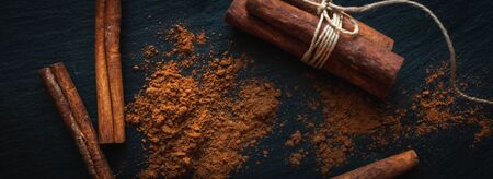 Aromatic cinnamon sticks and powder on table, closeup view with space for text. banner design