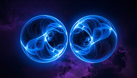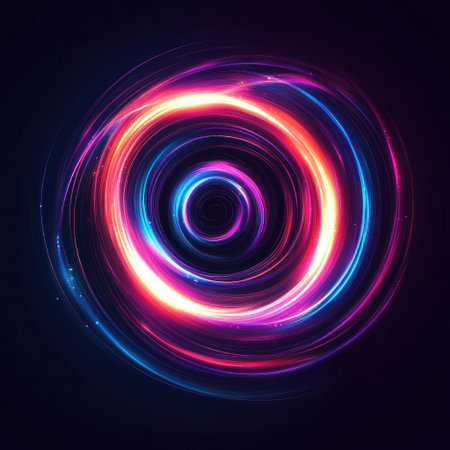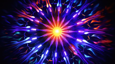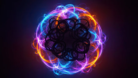 An abstract illustration presents a radiant energy orb with vibrant neon light effects. The circular composition features shades of blue, orange, and purple, set against a dark backdrop. This visually dynamic image could be useful for science, technology, or creative design projects. The overall style is modern.