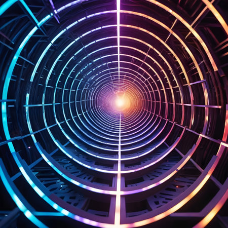 This image features a futuristic tunnel with a radial design that conveys a strong sense of depth. The tunnel structure is composed of concentric circles with intricate patterns, giving the appearance of a technologically advanced corridor, perhaps within a spaceship or a scientific facility. Vibrant neon lights in hues of blue and purple line the edges of the circles, highlighting the geometric patterns and enhancing the tunnels sci-fi aesthetic. The perspective is from inside the tunnel looking towards a bright light at the vanishing point in the center, suggesting an exit or destination.
