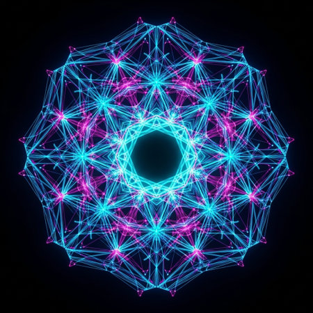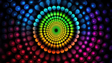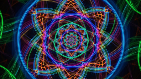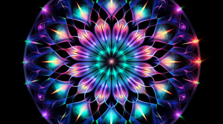 A mesmerizing neon mandala with intricate patterns and vibrant colors radiating energy and symmetry. The glowing lines and geometric shapes create a dynamic and visually stunning abstract artwork that captivates the viewer.. AI Generation