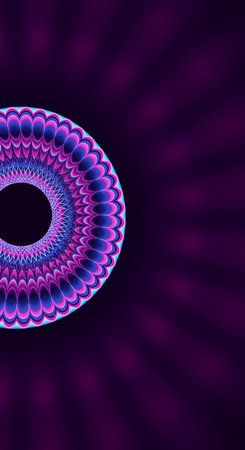 Psychedelic Coral and purple kaleidoscope with yellow spirals. Optical expansion illusion