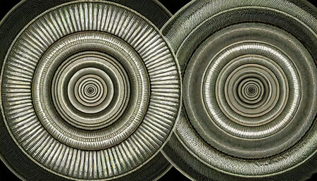 A detailed abstract pattern of concentric metallic circles, beads, and wire mesh creates a complex spiral on a dark, high-contrast background.
