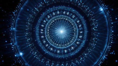 This mesmerizing abstract image features a blue digital vortex filled with glowing particles and intricate circular patterns, representing a journey through the realms of technology and infinity.