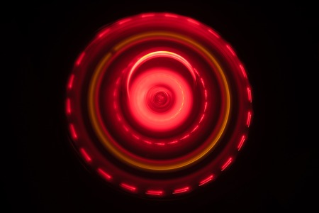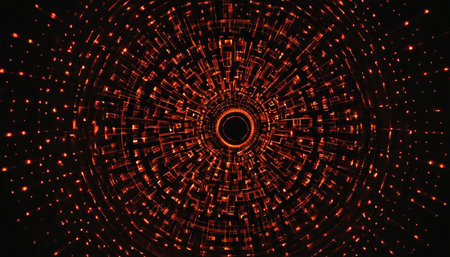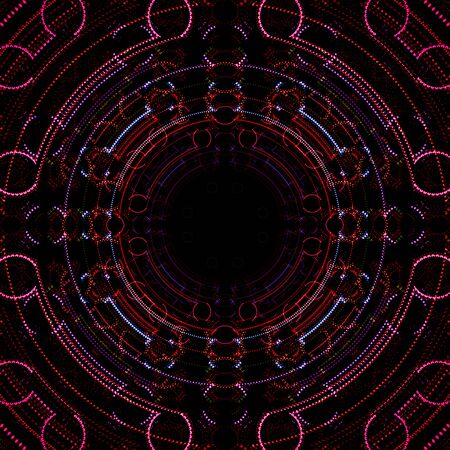 This abstract image showcases a mesmerizing circular design with intricate red patterns radiating from a bright center light, creating a stunning visual effect.