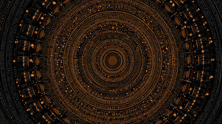 This image depicts a mesmerizing tunnel with a golden spiral pattern. The tunnel appears to extend infinitely, creating a sense of depth and mystery. The warm, golden hues add a sense of warmth and tranquility to the scene. The repetitive circular patterns draw the viewer's eye towards the vanishing point, evoking feelings of infinity and exploration.