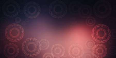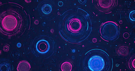 This abstract image features numerous glowing digital circles in shades of blue and magenta, set against a dark backdrop. The composition is symmetrical, with a repeating pattern. The style evokes a futuristic aesthetic, suitable for illustrating technological concepts or design projects. It could be used for various commercial or editorial purposes.