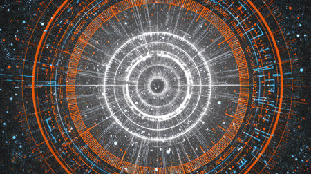 An abstract digital illustration presents a circular design comprised of concentric rings and radiating lines. The color palette includes orange, blue, and white elements against a dark backdrop. The composition suggests a technological or scientific concept, lending itself to various commercial and design projects.