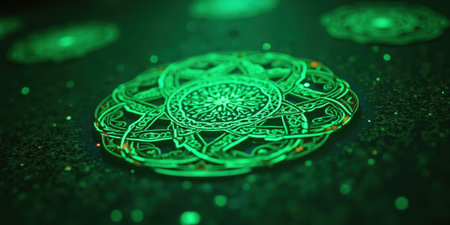 Swirling Celtic knots glow faintly neon green against a dark emerald field, celebrating St. Patricks Day heritage with futuristic flair.