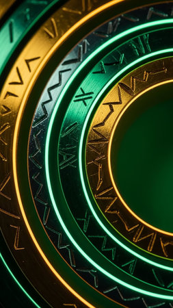 A detailed close-up of a circular metallic featuring concentric rings with etched symbols, illuminated by vibrant green and orange neon lights.