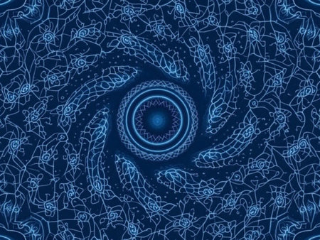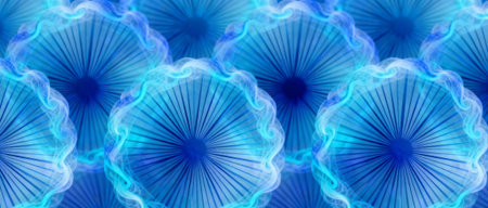 Abstract pattern of luminous blue jellyfish with radiating lines and glowing edges forming a underwater design.
