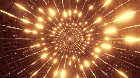 Abstract 3D rendering of chaotic tunnel with glowing particles. Futuristic background for your design.