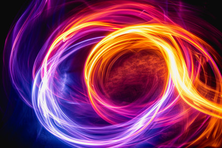 A mesmerizing display of colorful light trails swirls gracefully against a deep black background, creating a sense of movement and energy. The vivid hues of orange, blue, and green intertwine, evoking a feeling of dynamism and creativity, perfect for modern design projects.