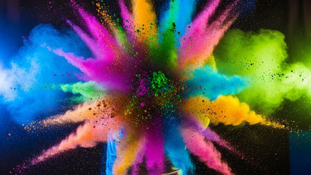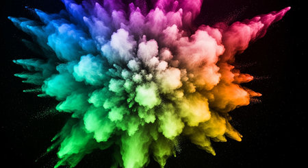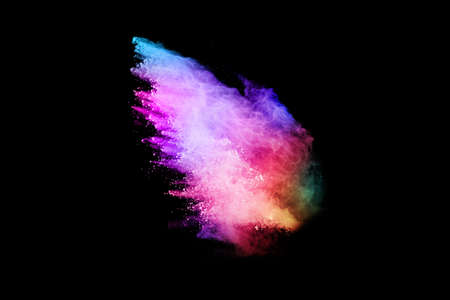 Colorful powder explosion isolated on black background. Abstract colored dust cloud.