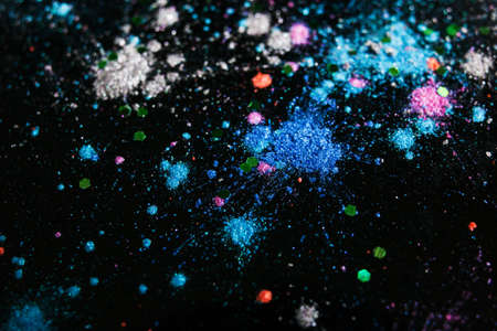 Colorful powdery splashes close up. Professional abstract pigment cosmetics background and colourants for creative make up