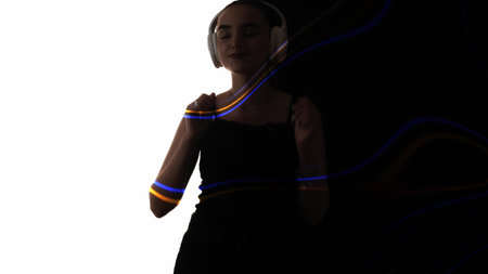 Music energy. Sound pleasure. Modern technology. Colorful neon ray waves double exposure silhouette of woman enjoying dancing in headphones isolated on white black.