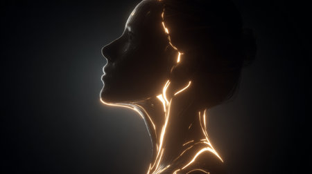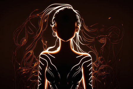 This striking image features an ethereal female silhouette highlighted with glowing light accents, set against a dark backdrop. It captures a sense of elegance and beauty, evoking feelings of tranquility and inspiration.