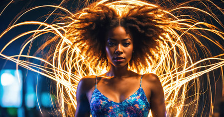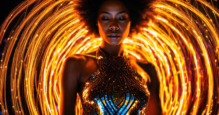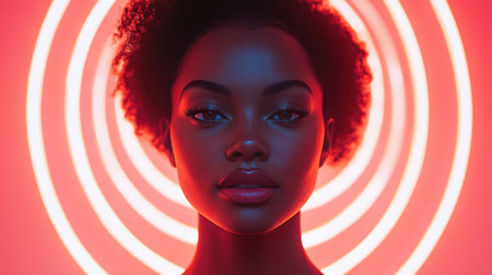 A woman with natural curly hair stands confidently in front of bold neon lights that form concentric circles. The lighting emphasizes her facial features and creates a captivating atmosphere.
