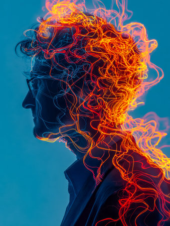 A striking digital portrait capturing a man's side view, with luminous crimson and orange streaks swirling upward, creating an otherworldly, flames-inspired hairstyle.
