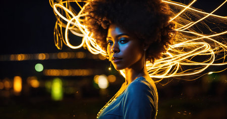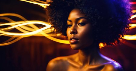 Beautiful african american woman with afro hairstyle and outlined in light. ai generative.