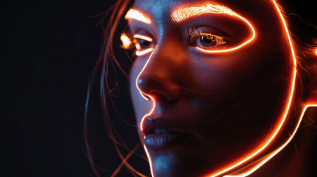 Woman with glowing red lines on face in futuristic style.