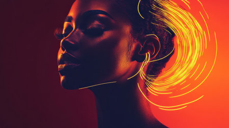 A woman is illuminated against a deep red background, her profile showcasing a radiant glow. Swirling light trails encircle her head, creating a captivating aura of energy.