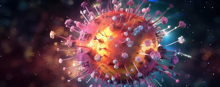 Wide aspect ratio of a stylized virus particle, symbolizing the impact of pandemics