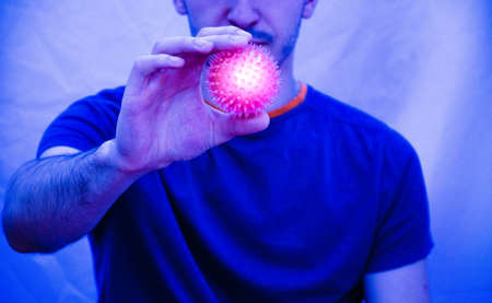 A man in a gray T-shirt on a dark background is holding a bright virus in front of him. Coronavirus. The disease is an epidemic of infection. Virus on the palm