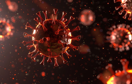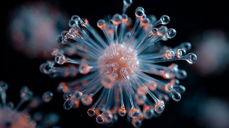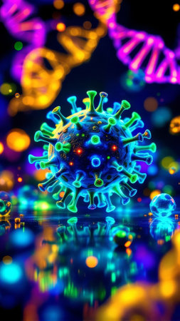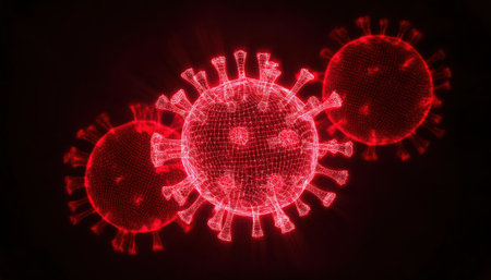 A striking visual representation of a firefly hologram illustrating the structure of a red virus on a dark backdrop. The design emphasizes the virus's unique features and intricate forms.
