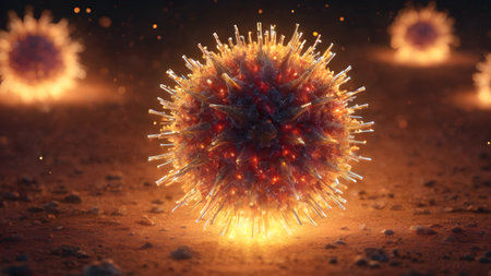 3D rendering of a virus particle with spike proteins, surrounded by glowing antibodies or immune cells