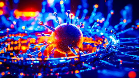 A colorful, glowing sphere with many points. It looks like a virus. The sphere is surrounded by a dark background