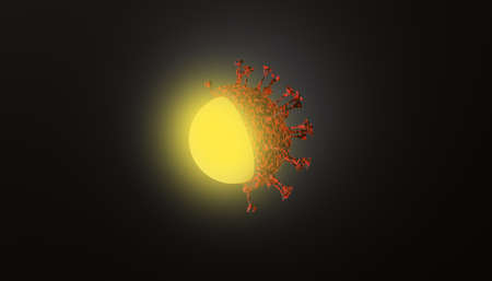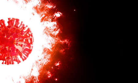 Creative computer graphics CG 3D illustration of a red and aggressive corona virus cell shining and burning with scarlett flames against a black background for depicting the pandemic of covid-19.