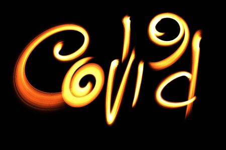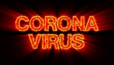 Coronavirus COVID-19 inscription made by fire. Medicine and drug concept illustration isolated on black background. Coronavirus epidemic condition
