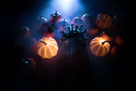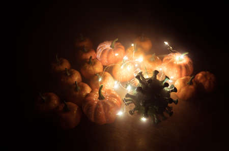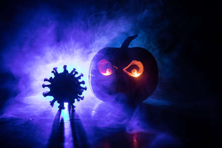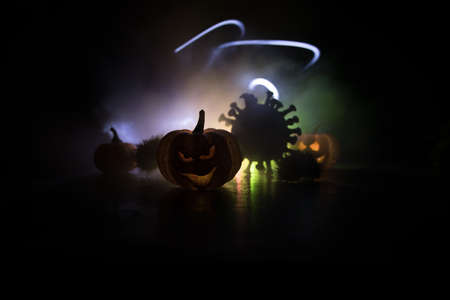 Halloween during Corona virus global pandemic concept. Glowing pumpkins and Covid novel on dark with thematic spooky decorations. Halloween pumpkin on foggy backlight. Selective focus