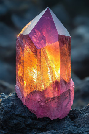 A striking crystal formation stands prominently on a rugged surface, showcasing vibrant hues of pink and orange. The natural light enhances the crystal's facets, creating a breathtaking visual effect during the early morning hours.