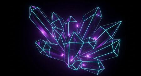 A central cluster of sharply pointed geometric crystals dominates The crystals are outlined with a bright neon blue light, and their inner facets radiate a soft purple glow. The arrangement is dense and spiky, creating a powerful visual focal point against the dark background. The sharp angles and luminous edges contribute to a futuristic and almost otherworldly aesthetic.